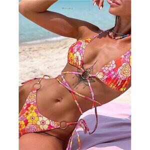 Pink Multi Floral Printed Wrap Around Strappy Bikini Swimsuit Bathing Suit Set