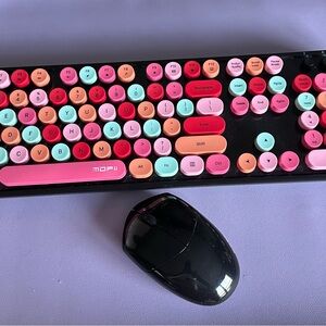 Stylish keyboard in pink multi tones for a playful home office setup. Rounded keycaps deliver a comfortable, tactile typing experience. Compact wireless design keeps your desk uncluttered. Includes vibrant pink, coral, mint, and red key accents for a cheerful look.