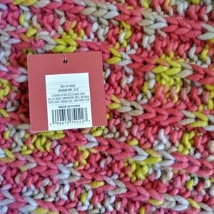 Pink, green, and blue multi-colored knit infinity scarf. Mossimo Supply Co. Photos of measurements included. New with tags. 100% Acrylic. Photo of the scarf with size medium tee shirt provided to give a better idea of the size.