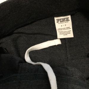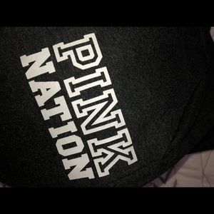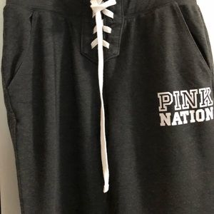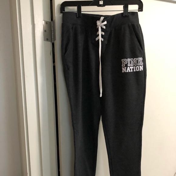 With shoe string design in front of pants, pockets on the side, Color-Dark gray with white lettering that’s says “PINK NATION Tags removed, NWOT ,, Sweatpants. Size-S/P