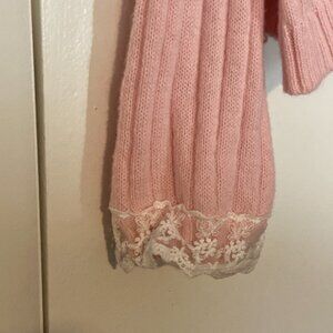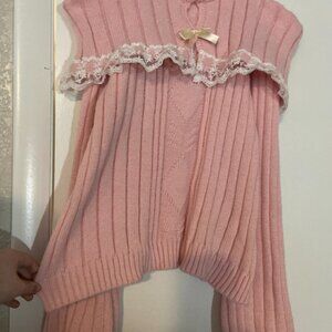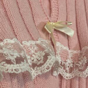 Pink Knit sweater with white lace detailing and cream colored bow