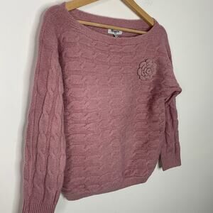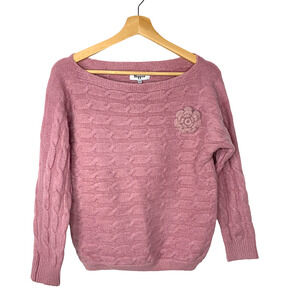 Pink Off Shoulder Sweater Military Hippie Dusty Rose Flower Pin Large NWT