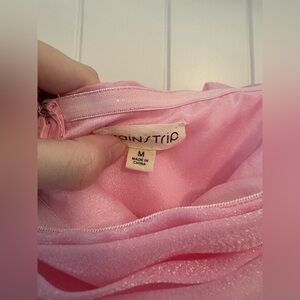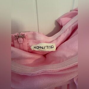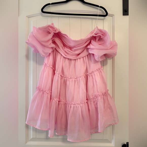 Chic pink off-shoulder dress with ruffle details. Perfect for a stylish look.