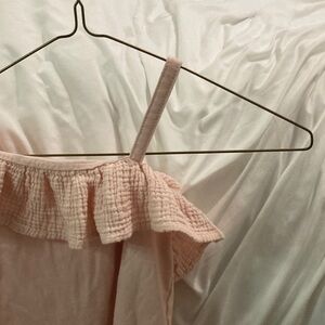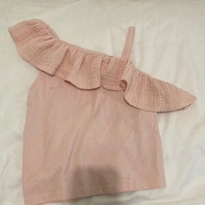 Stylish pink one-shoulder top with ruffle detail. Perfect for a chic look.