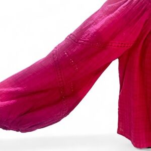 Beautiful silhouette with off-the-shoulder ruffled neckline and billowy sleeves with elastic cuffs.