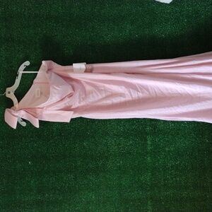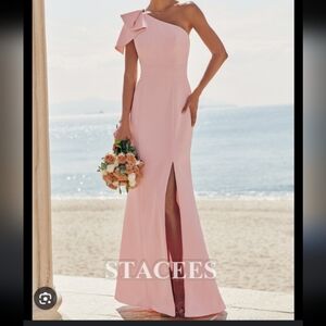This elegant pink gown showcases an asymmetrical one-shoulder neckline with ruffled detailing, perfect for a wedding or cocktail event. The floor-length design features a stylish slit, adding a touch of sophistication and movement. Its sleek silhouette ensures a flattering fit for any special occasion.