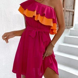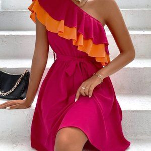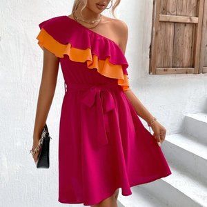 Ruffle Trim One Shoulder Belted
