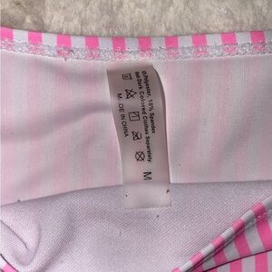 Stylish pink one-shoulder bikini set with ruffle detail. Features pink and white striped bottoms.