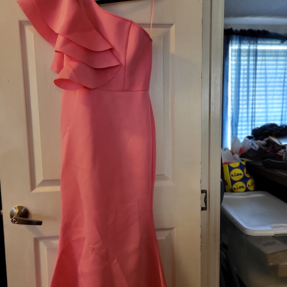 Elegant pink one-shoulder dress with ruffle detail. Perfect for special occasions. 5feet long