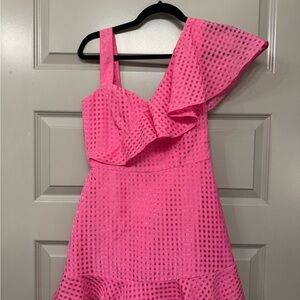 Stylish pink one-shoulder dress with ruffle details. Perfect for any occasion.