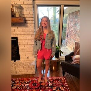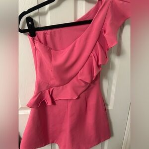 Stylish pink one-shoulder romper with ruffle detail. Perfect for a chic look. High end local boutique, brand is DeeDee. Great condition.