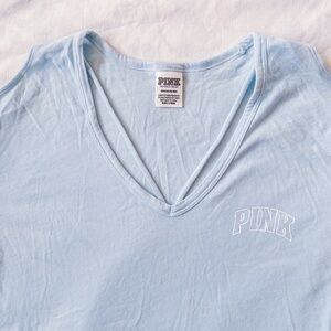 Made of a light, breathable material and is a light sky blue in person. This shirt has cutouts on the shoulders, a gorgeous string pattern on the neckline, and lettering down the side of the left sleeve. PINK logo in the top left corner of the top (when worn). No flaws whatsoever upon close inspection. In almost new condition and am willing to take the best offer!