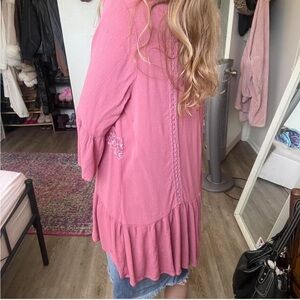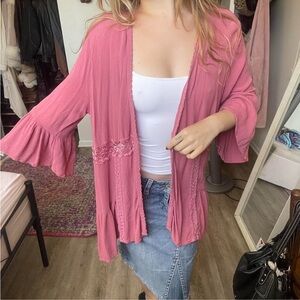 Lightweight open-front kimono cardigan in dusty rose pink. Flowy ruffled sleeves and tiered hem. Delicate crochet trim details. Easy layering piece for casual outfits.