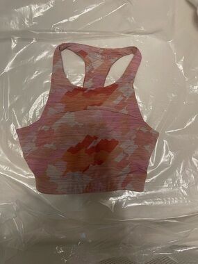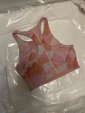 Soft racerback sports bra with abstract pink and orange pattern. Stretchy, supportive fit. Vibrant multi-color design ideal for workouts or athleisure. Removable cups. Color is a little brighter in person!