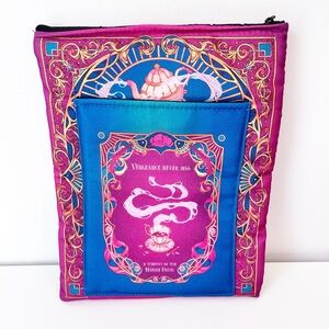 This pink tablet case showcases a whimsical and ornate design. Can fit a hardcover book or iPad sized tablet.