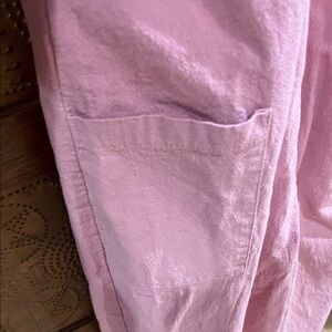 Stylish pink linen overalls with adjustable straps and pockets.