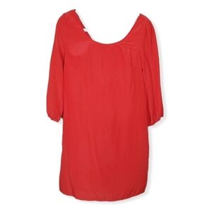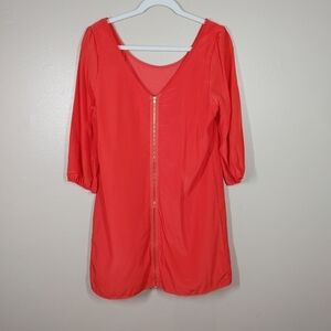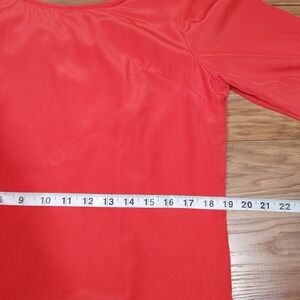 Pink Owl Red Orange Zip Back Shift Dress Size Large. red, orange color. scoop neck front and v back. full zip up back. fully lined. slight puff sleeve. 3/4 sleeves. polyester. small spot on shoulder (please see pic). measurements are approximate.