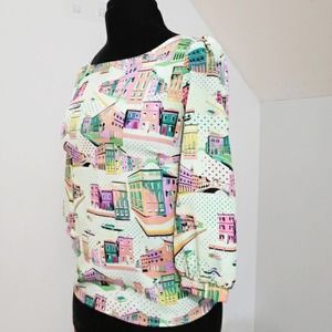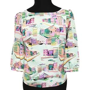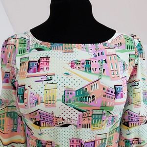 Pink Owl Vibrant Colorful City Scene 3/4 Sleeve Top Small