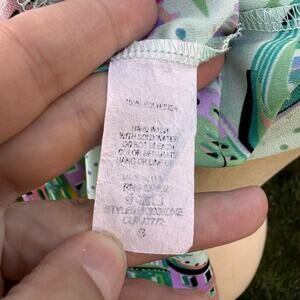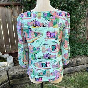 Pink Owl Vibrant Colorful City Scene 3/4 Sleeve Top Woman's Small. In good preowned condition. Measurements are approximate taken flat.