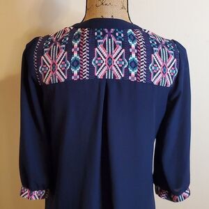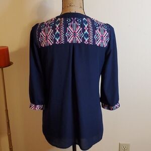 Pink Owl navy blue and Aztec print at cuffs and back yoke, 3/4 sleeves, V neck top, one front pocket, size Small. Excellent pre loved condition, measurements in pics, smoke free home, ships next day. Bundle and Save!