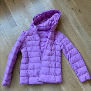 Stylish pink puffer jacket with a hood. Perfect for chilly days.