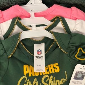 Adorable pink Packers baby onesie with floral accents. Perfect for little fans.