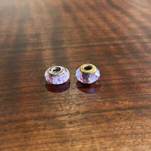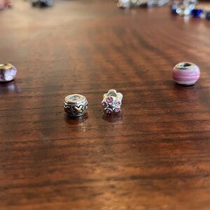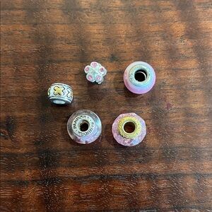 Bundle of five beads: two are Pandora (pink crystal and pink glass swirl), one glass marked 925, one silver with pink crystals, one silver with gold X’s. Price firm.