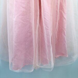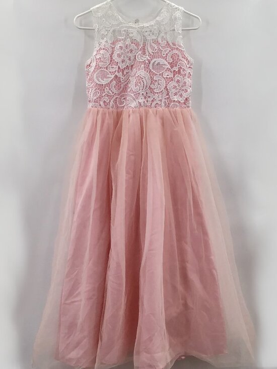 A pretty, girly, empire-waisted dress at an affordable price, perfect for birthday parties, princess costumes, Easter, flower girls, and other formal occasions. Or hey, why not any day! The sleeveless bodice has an ornate floral lace overlay lined in opaque pink, which itself is further lined for comfort and stability. It has an invisible zip and hook + eye closure on the back. The skirt has multiple floofy layers: Two tulle overlayers that float like a cloud over a layer of pink satin, and an underskirt with an additional tulle ruffle around its hem for extra body. If you really want to go all out and achieve a bell silhouette, you could pair this with a crinoline underneath.