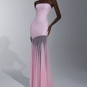 Pink Party Women's Elegant Bodycon Strapless maxi Mesh hem Dress