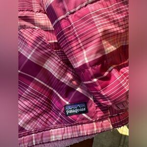 This adorable pink Patagonia puffer is perfect for the little one in your life! It's reversible, with a soft fuzzy side as well as a shiny side, too. It's in play condition—the fuzzy side has flattened a bit from use, but there are no stains, holes, or any major damage or defect.
