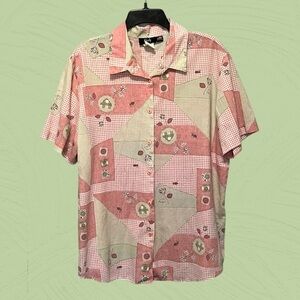 Vintage Tapestry Button Up Blouse • Size Large • Patchwork with Floral, Bees, Hearts, and Checkered Print in Pink and Green • Short Sleeve Top • Made in the USA