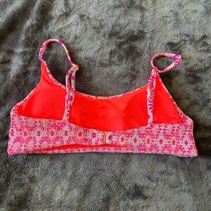 Stylish and vibrant pink patterned bikini top perfect for summer. Enjoy a comfortable fit with adjustable straps. Ideal for beach days and poolside lounging.