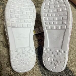These stylish 'clog feature a vibrant pink pattern, perfect for working in the garden. They are NWT and is made out of some kind of plastic material.