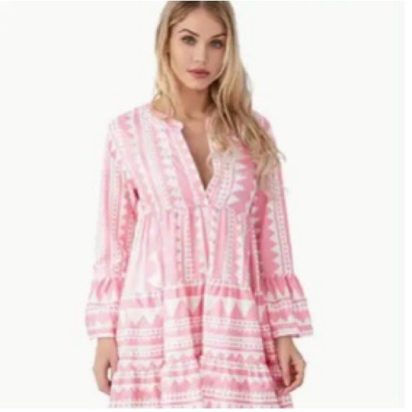 Stylish pink dress with intricate patterns. Perfect for casual outings.