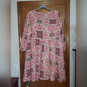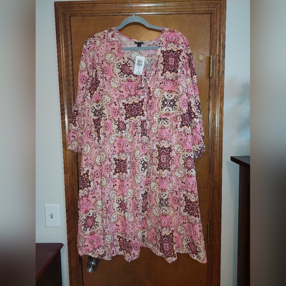 Stylish pink, cream, and brown boho dress with intricate patterns. Includes slip dress underneath and pockets. Perfect for casual outings. Size 2, knee-length. Brand new with tags. Smoke-free and pet-free home.