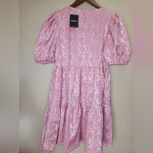 Charming pink dress with an elegant pattern, perfect for special occasions.