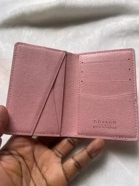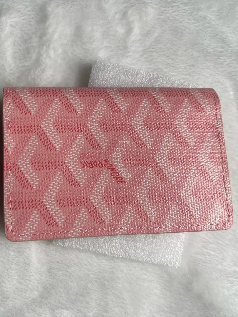 Compact fold wallet with a repeating textured pattern. Multiple interior slots for cards and bills. Snap or fold closure for secure carry. Feminine pink tone enhances outfits.