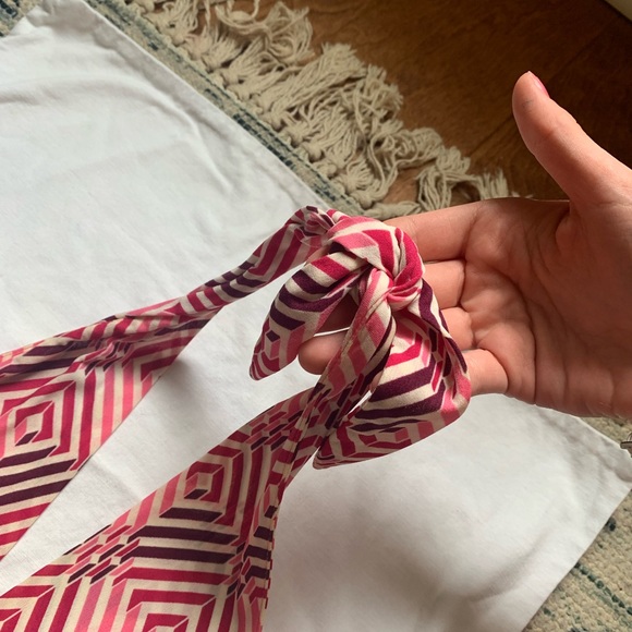 This top is so fun and beautiful! I love it, just simply doesn’t fit anymore. There is a very small (unnoticeable) stain (pictured). The top is very flattering, and perfect for summer :)