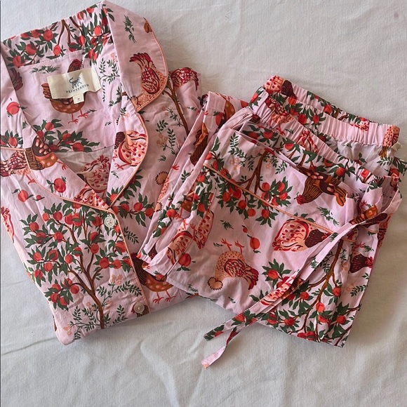 Charming pink pajama set with a vibrant spring chicken pattern. Perfect for cozy nights. NWOT