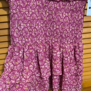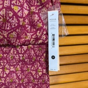Chic pink dress with a unique pattern and ruffle details. Perfect for any occasion. Shimmery gold specs, awesome fit and design by Aqua!