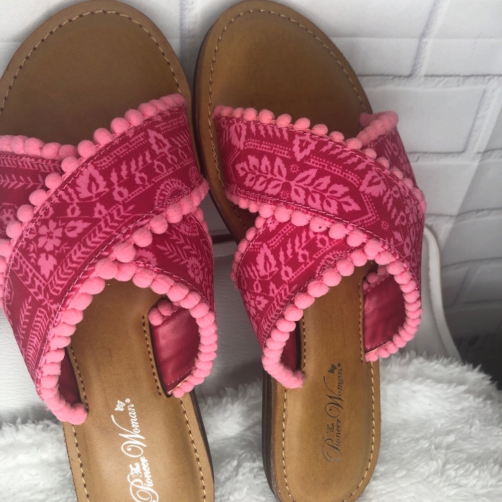 Step into style with these pink patterned sandals by . Perfect for casual outings, these sandals offer both comfort and flair. The Pioneer Woman Slide Sandal 7 Women's Pink Crossband Pom Pom Slip-On Comfort