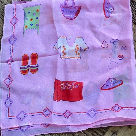 Vibrant pink scarf with colorful patterns. Features various fashion-themed illustrations.