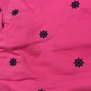 Pink shorts with embroidered navy blue sailing wheel. Mid waist.