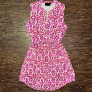Embrace vibrant style with this pink patterned sleeveless dress. Perfect for any occasion, it offers comfort and elegance.