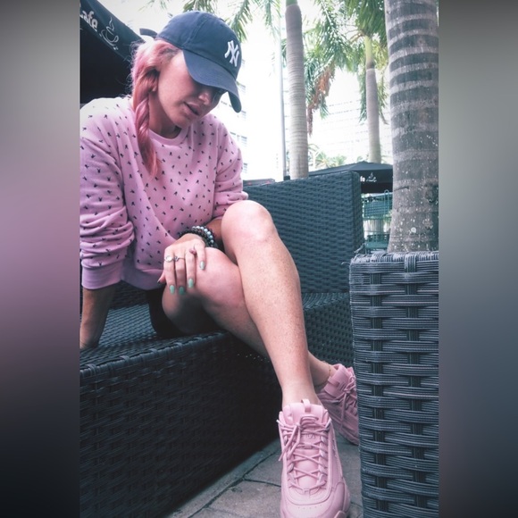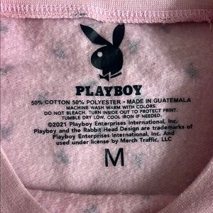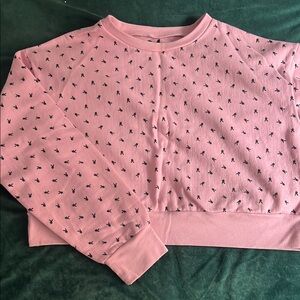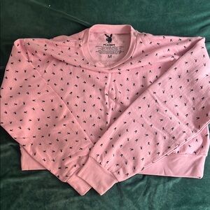 Cozy pink sweatshirt with a playboy bunny pattern. Perfect for casual wear. Spotted slightly on right sleeve. 50% cotton.