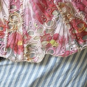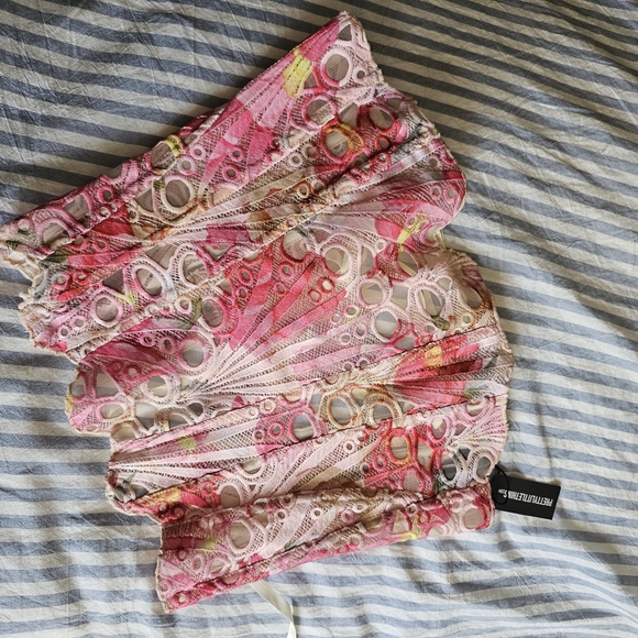 Vibrant pink corset top with intricate floral-like patterns. Perfect for a stylish look, night out, or springy summer look.