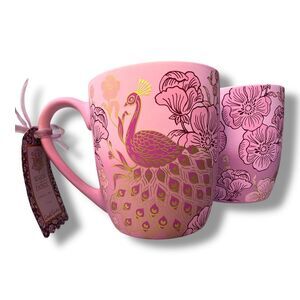 Stunning matte pink ceramic mug featuring a majestic peacock surrounded by florals in metallic gold foil. Elegant and eye-catching, perfect for sipping tea or coffee or displayed as decorative art. Soft touch finish. Ideal gift for maximalists, collectors, or glam kitchenware fans.