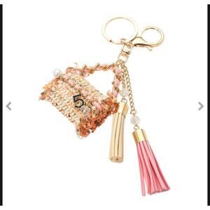 This is a great novelty piece. It is a Pink Pearl Number Five Stone Charm Accent Tweed Handbag Tassel. This Keychian / Bag Charm is the perfect addition to your accessories.
