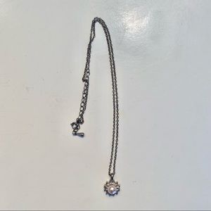 The sweetest little necklace ever. Has a pink pearl on the inside, surrounded by tiny crystals to form a snowflake like shape. Super delicate and gorgeous. Comes with a. silver chain. No flaws!