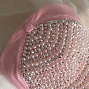Stylish pink cap adorned with pearls and rhinestones.